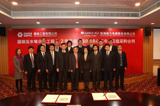 2015年12月28日,國(guó)核壓水堆示范項(xiàng)目(CAP1400)1、2號(hào)機(jī)組MS01離心式冷水機(jī)組采購(gòu)合同簽字儀式在格力電器珠??偛颗e行。國(guó)核工程有限公司和珠海格力電器股份有限公司雙方代表在采購(gòu)合同上簽字,國(guó)核工程總經(jīng)理孫文科、國(guó)家核電專家委員會(huì)副主任孫昌基、格力電器董事長(zhǎng)總裁董明珠等相關(guān)領(lǐng)導(dǎo)共同出席并見證雙方的簽字儀式。這是格力首筆核電訂單項(xiàng)目,標(biāo)志著格力正式進(jìn)入核電市場(chǎng),同時(shí)也意味著格力的產(chǎn)品品質(zhì)獲得了有嚴(yán)苛標(biāo)準(zhǔn)著稱的核電站的認(rèn)可。