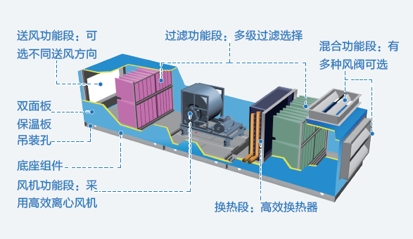 3. 功能段豐富,粗效、中效、亞高效和高效多種不同過濾等級(jí)的過濾器及殺菌裝置,可選配紫外光燈、活性炭過濾器、納米光觸媒等綠色功能段,達(dá)到空氣處理的潔凈等級(jí)要求。